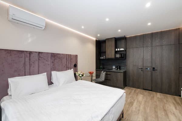В замечательном районе Киева, на ул. Саксаганского, 42/1 находится квартира «Flat Lux». К центральной части столицы всего пару минут ходьбы. В квартире одна комната, обустроенная мебелью, техникой. В ванной есть джакузи, для расслабления — отличный вариант. Круглосуточная подача воды позволит наслаждаться водными процедурами в любое время суток. По всей территории есть бесплатный Интернет. При необходимости, можно воспользоваться утюгом, гладильной доской. Кухонная зона с аксессуарами для приготовления еды предполагает самостоятельное приготовление вкусных обедов. От апартаментов к Ж/Д вокзалу 1,8 км, к ближайшее ст. М. «Университет» 5 мин ходьбы.